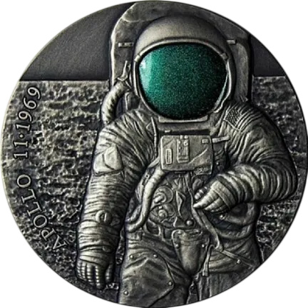 Скафандр астронавта, изображенный на реверсе, представляет собой одну из самых ярких особенностей его шлема с нанесением специального цвета. Надпись по окружности - APOLLO 11 1969.