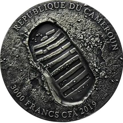 На аверсе, выполненном с высоким рельефом, запечатлен Тот самый След Базза Олдрина, когда он ступил на девственную поверхность Луны. Название страны-эмитента: REPUBLIQUE DU CAMEROUN; номинал - 3000 FRANCS CFA; год - 2019; чистота металла - Ag 925.