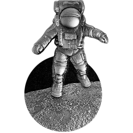 На реверсе монеты изображена знаменитая прогулка Нила Армстронга по поверхности Луны. Астронавт выполнен в высоком рельефе, а верхняя часть монеты имеет форму человека, а нижняя часть имеет круглую форму. Луна и астронавт выполнены в античной отделке, пространство раскрашено и украшено множеством белых точек, символизирующих звезды.