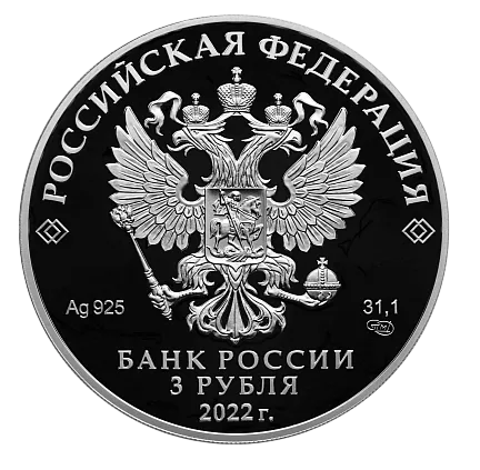 Аверс: на зеркальном поле диска — рельефное изображение Государственного герба Российской Федерации, над ним вдоль канта — надпись полукругом: «РОССИЙСКАЯ ФЕДЕРАЦИЯ», обрамленная с обеих сторон сдвоенными ромбами, внизу под гербом: слева — обозначения драгоценного металла и пробы сплава, справа — содержание химически чистого металла и товарный знак монетного двора, внизу в центре в три строки — надпись: «БАНК РОССИИ», номинал монеты: «3 РУБЛЯ», год: «2022 г.».