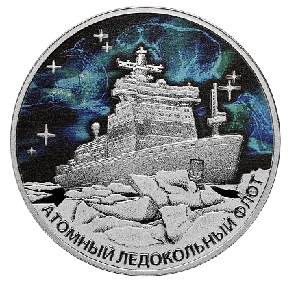 Реверс: на зеркальном поле диска — рельефные изображения атомного ледокола «Урал», ледяных глыб и звезд на фоне выполненного в цвете изображения северного сияния; внизу вдоль канта — надпись: «АТОМНЫЙ ЛЕДОКОЛЬНЫЙ ФЛОТ».
