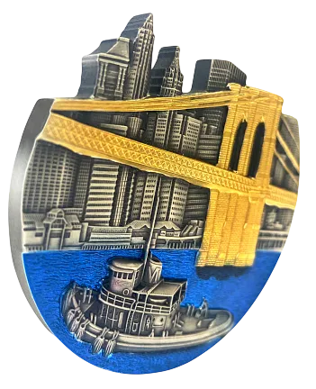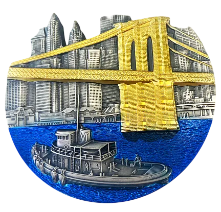 На реверсе монеты изображен прекрасный вид на Бруклинский мост. Фоном для моста служат небоскребы с античной отделкой и замысловатой штамповкой, а их крыши, вырезаны по контуру, повторяют горизонты Нью- Йорка и создают уникальный рельеф монеты. По реке, разделяющей Манхэттен на Квинс и Бруклин, плывет слегка деформированное судно, изогнутое для того, что бы чтобы передать перспективу соответствующую форме монеты. Сам мост отчеканен в высоком рельефе, позолочен 24-каратным золотом, а вода Ист-Ривер сияет тысячей огней, благодаря окраске многоцветной эмалью. Все эти детали воссоздают красивый вид на город начала-середины 20-го века.