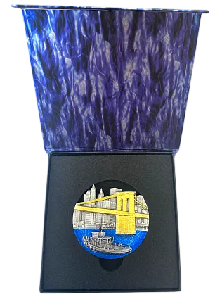 САМЫЙ ИЗВЕСТНЫЙ МОСТ МИРА - ПОНТ-ДЕ-БРУКЛИН С момента своего создания в 1890 году Atelier P. De Greef является одним из самых востребованных в Европе магазинов высококачественных медалей и наград. Престижное звание «Запатентованный поставщик двора Бельгии» свидетельствует о необычайном мастерстве его ударов. Своими горельефами с неповторимой отделкой, изготавливаемыми небольшими сериями и в основном вручную, П. Де Гриф восхищает и мир коллекционеров. Для этого издания Atelier P. De Greef смог пригласить еще одного художника высокого уровня. Это Хоакин Хименес, главный гравер Monnaie de Paris, чьи рисунки украшают многие французские и международные монеты евро. Знаменитый медалист впервые разработал для П. Де Грефа горельеф, дизайн которого столь же требователен, сколь и эффектен. Серебряная монета весом 5 унций посвящена Бруклинскому мосту (Brooklyn Bridge). Он представляет собой внушительную работу, подчеркнутую применением чистого золота. Ист-Ривер, через которую он проходит, ярко сияет эмалью, а очертания изделия прерываются замысловатым тиснением, повторяющим всемирно известный горизонт Нью-Йорка. Связь между горельефом и комурной печатью требует передовых ноу-хау. Более 75% многих этипесальных работ не должны выполняться вручную. Это произведение является одним из самых ярких произведений Хоакина Хименеса, как и мастера-медалисты П. Де Гриле.