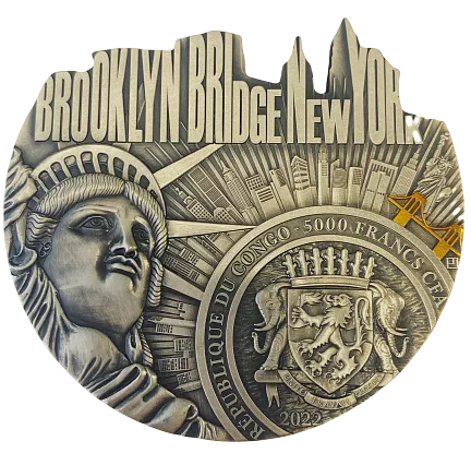 На аверсе монеты изображена деталь Статуи Свободы и герб Конго с надписями: «REPUBLIQUE DU CONGO» , «5000 FRANCS CFA» и «2022» . Над гербом красивое изображение горизонта Манхэттена. Вверху вдоль канта надпись: «BROKLYN BRIDGE NEW YORK».