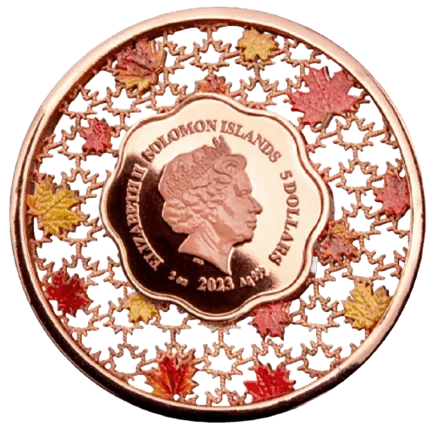 Монета «Филигранный Кленовый лист. 35 лет выпуска», 2023 г., Серебро, 62,2 гр., проба 999, СОЛОМОНОВЫ ОСТРОВА