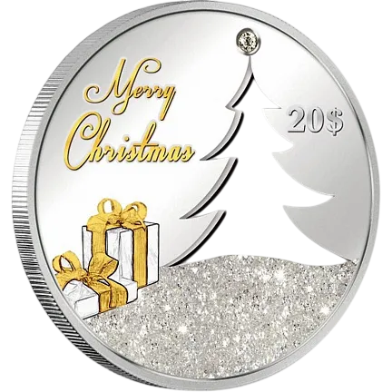 Реверс представляет изображение елки, насквозь вырезанное в монете. Вокруг изображены подарки с позолоченными ленточками и надписью «Merry Christmas». Снег украшен цирконием. Также указан номинал «20 $».