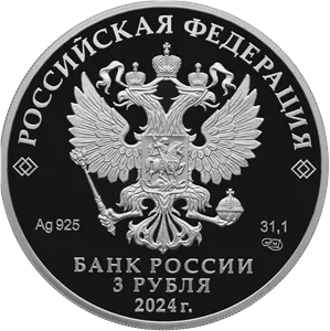 Аверс: рельефное изображение Государственного герба Российской Федерации, над ним вдоль канта – надпись полукругом «РОССИЙСКАЯ ФЕДЕРАЦИЯ», обрамленная с обеих сторон сдвоенными ромбами, под гербом слева – обозначения драгоценного металла и пробы сплава, справа – содержание химически чистого металла и товарный знак монетного двора, внизу в центре в три строки – надпись «БАНК РОССИИ», номинал монеты «3 РУБЛЯ», год выпуска «2024 г.».