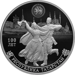 Реверс: на зеркальном поле диска – рельефное изображение молодых людей в традиционных татарских костюмах, исполняющих национальный танец, с видом на Казанский кремль; вверху – герб республики; внизу вдоль канта – надпись: "РЕСПУБЛИКА ТАТАРСТАН", слева – надпись в две строки: "100 ЛЕТ".