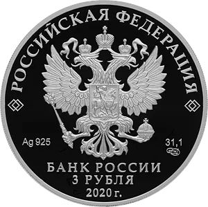 Аверс: на зеркальном поле диска – рельефное изображение Государственного герба Российской Федерации, над ним вдоль канта – надпись полукругом: "РОССИЙСКАЯ ФЕДЕРАЦИЯ", обрамленная с обеих сторон сдвоенными ромбами, внизу под гербом: слева – обозначения драгоценного металла и пробы сплава, справа – содержание химически чистого металла и товарный знак монетного двора, внизу в центре в три строки – надпись: "БАНК РОССИИ", номинал монеты: "3 РУБЛЯ", год выпуска: "2020 г.".