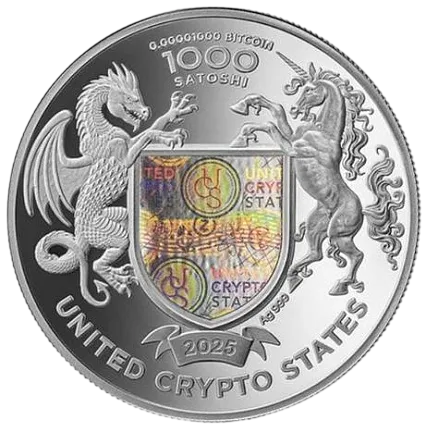На аверсе изделия изображен герб USC с драконом и единорогом по бокам. На гербе голограмма. Вверху надпись: 0.00001000 BITCOIN 1000 SATOSHI, внизу: 2025 Ag999 UNITED CRYPTO STATES.