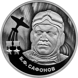 Реверс: рельефные изображения портрета дважды Героя Советского Союза Б.Ф. Сафонова и медалей «Золотая Звезда» на фоне выполненных в технике лазерного матирования изображений силуэта летящего самолета, оставляющего за собой след, и северного сияния; под портретом полукругом расположена рельефная надпись «Б.Ф. САФОНОВ».