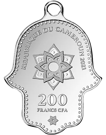 HAMSA Hand Of Fatima Серебряная монета 200 франков Камерун 2021. Эта монета посвящена самому популярному амулету на Ближнем Востоке и в Северной Африке - Руке Фатимы или Руке Хамсы.
